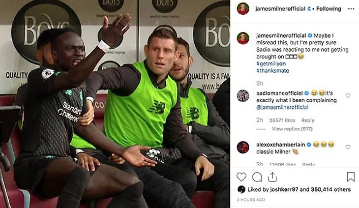 * - комментарий Джеймса Милнера: «Может я что-то не понял, но я почти уверен, что Садио так среагировал на то, что меня не выпустили на замену». Комментарий Садио Мане: «Именно на это я и жаловался». Комментарий Алекса Окслейда-Чемберлена: «Классический Милнер.»