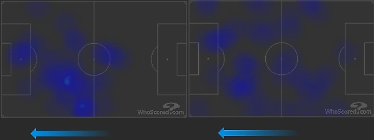Тепловые карты Александра Соболева в матче «Спартак» — «Крылья Советов» (2:0) (слева) и «Оренбург» — «Спартак» (1:3) (справа). Фото whoscored.com