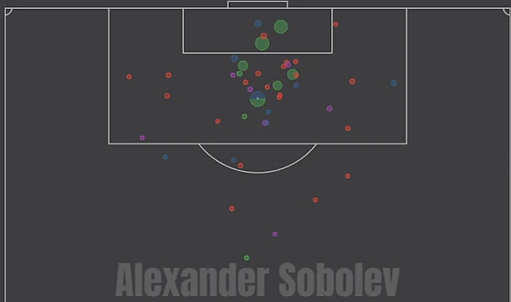 Соболев же в первой половине сезоне зажигал в «Крыльях». Он был (и остается) лучшим бомбардиром команды в РПЛ (10), а также лидером по созданным моментам: 7,27 xG. Александр в среднем наносил 2,49 удара за 90 минут — преимущественно из пределов штрафной площади:
