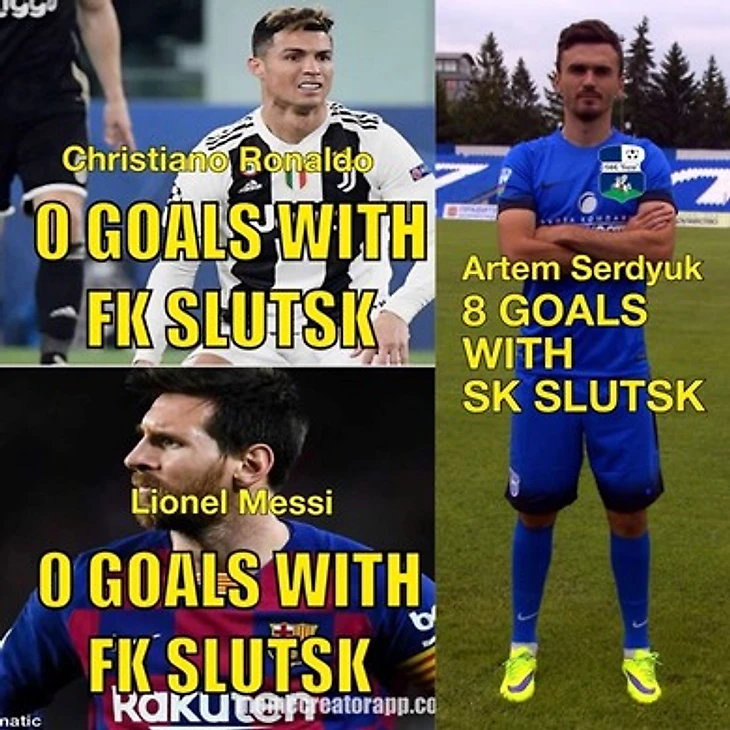 Главный герой матча (и некоторых забавных мемов) Артем Сердюк появился только на замену в связи с травмой партнера. Между тем, только заглянув в профайл футболиста, я вспомнил, что пару сезонов назад Артем играл за «Факел». За год, проведенный в Воронеже, сумел отличиться четыре раза и совершенно не запомнился. Он-то и в «Слуцке» игрок запаса, но свой звездный час уже успел пережить.