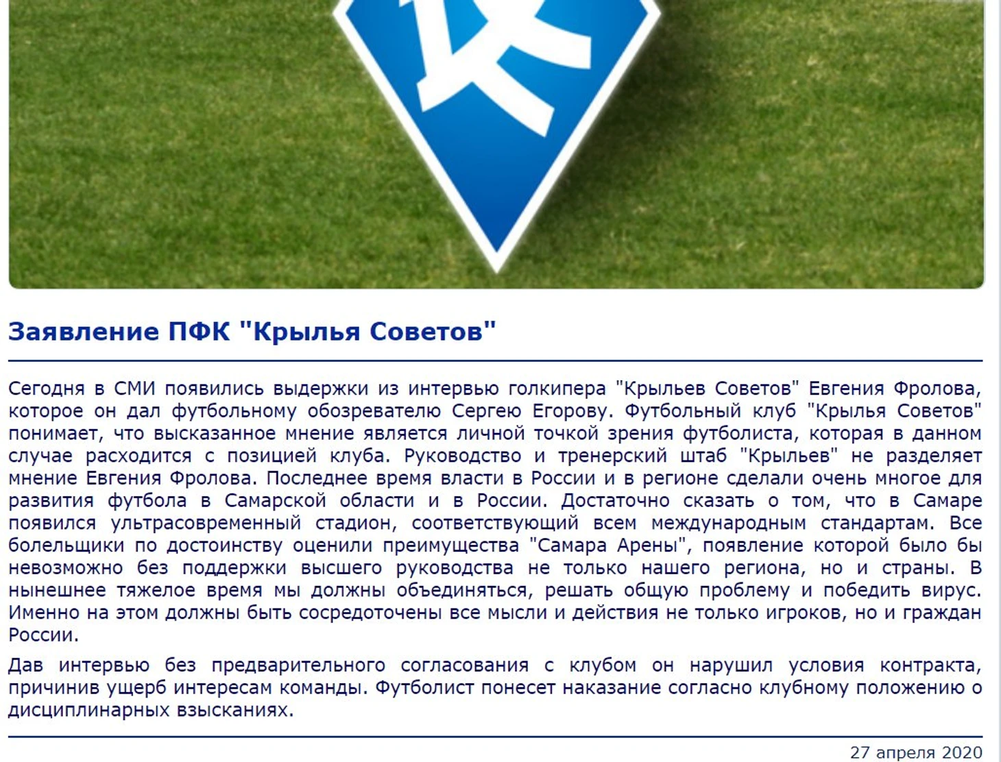 Первыми запаниковали «Крылья Советов», которые находятся в состоянии, которое порождает слухи о банкротстве. Фролов еще не закончил говорить, а они уже выпустили заявление о том, что в Самаре государство построило стадион, поэтому своего игрока мы оштрафуем, чтобы было неповадно. Но потом из заявления слова о штрафе тихо потерли. Я думал, что ничего более стыдного уже не случится. Однако случилось…