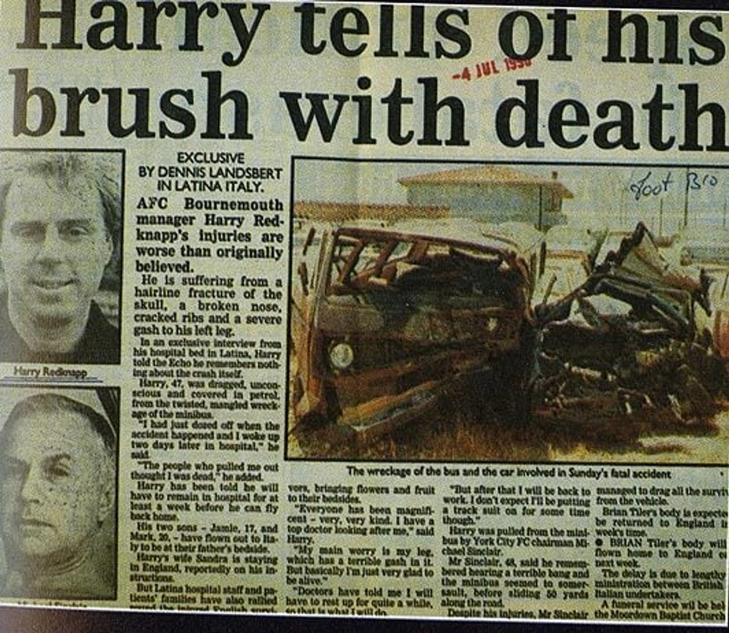 Реднапп очнулся только 3 июля – в больнице и с жуткими травмами: перелом черепа, перелом носа, сломанные ребра, ранение левой ноги. Ту аварию Харри не помнит до сих пор. События восстанавливал по полицейским отчетам и обрывкам из головы друзей. Автобус ехал по трехполосной дороге, где средняя полоса – для обгона. Машина с тремя итальянскими солдатами вылетела на тотальную встречку – пыталась обогнать авто, которое ехало по полосе обгона, на скорости 144 км/час.