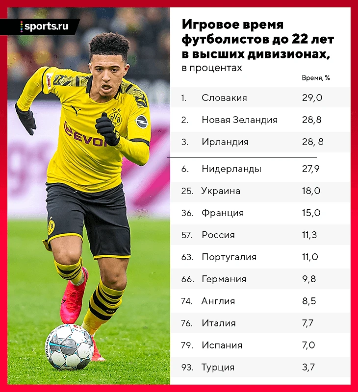 Игроки до 22 лет в РПЛ получают больше игрового времени, чем в Португалии (11,0%) и Германии (9,8%), которые обычно ставят в пример по доверию молодежи, а также Англии, Италии и Испании – то есть во всех чемпионатах топ-5 кроме Франции.