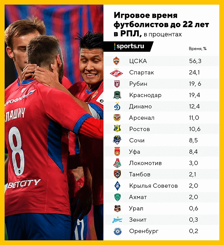 Космические цифры российской Премьер-лиге обеспечивает один клуб. ЦСКА занимает 11-е место в общем топе: армейцы выделяют молодым игрокам 56,1% игрового времени – в 2 раза больше «Спартака», который идет на втором месте.