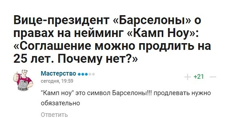 Торговля Родиной под названием Камп Ноу для верхушки ФКБ не является чем-то особенным, благо, начиналось правление дуэта Росель-Бартомеу с лишения поста почетного президента Йохана Кройффа. Хотел бы я сказать, что поражает, но нет, я не первый день на сайте наблюдаю за реакцией масс, которые именуют себя болельщиками «Барселоны». Привычно поддерживают сколь угодно ужасные начинания руководства самопровозглашенные кулес. Вот и сегодня третьим самым популярным комментарием (сразу после двух троллингов) к высказыванию Кардонера стали слова юзера Мастерство, написавшего: «"Камп ноу" это символ Барселоны!!! продлевать нужно обязательно». Написал он это к статье с заголовком: «Вице-президент «Барселоны» о правах на нейминг «Камп Ноу»: «Соглашение можно продлить на 25 лет. Почему нет?»». Сейчас этот кощунственный для болельщиков «Барсы» комментарий набрал 27 плюсов, наверняка большая часть заплюсовавших это рвет на себе сине-гранатовую тельняшку, если только где-нибудь что-то не так скажут о Бартомеу и Ко.