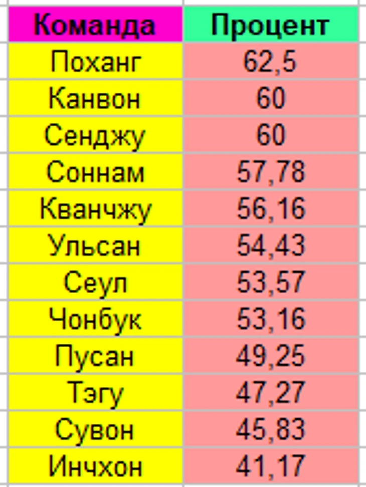 Тихие скромные новички. По ним нет таких массовых восторгов как по пусанцам. Но втордив-то кто выиграл? И у кого там была крутейшая оборона? Вот только оборону, конечно, пощипали. И Кванчжу пришлось перестраивать ту часть команды, которая была в наибольшем порядке. С другой стороны, их атака вполне себе прилична и, если стройность рядов сохранится, команде может побороться за место в районе десятого.