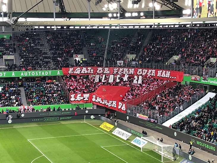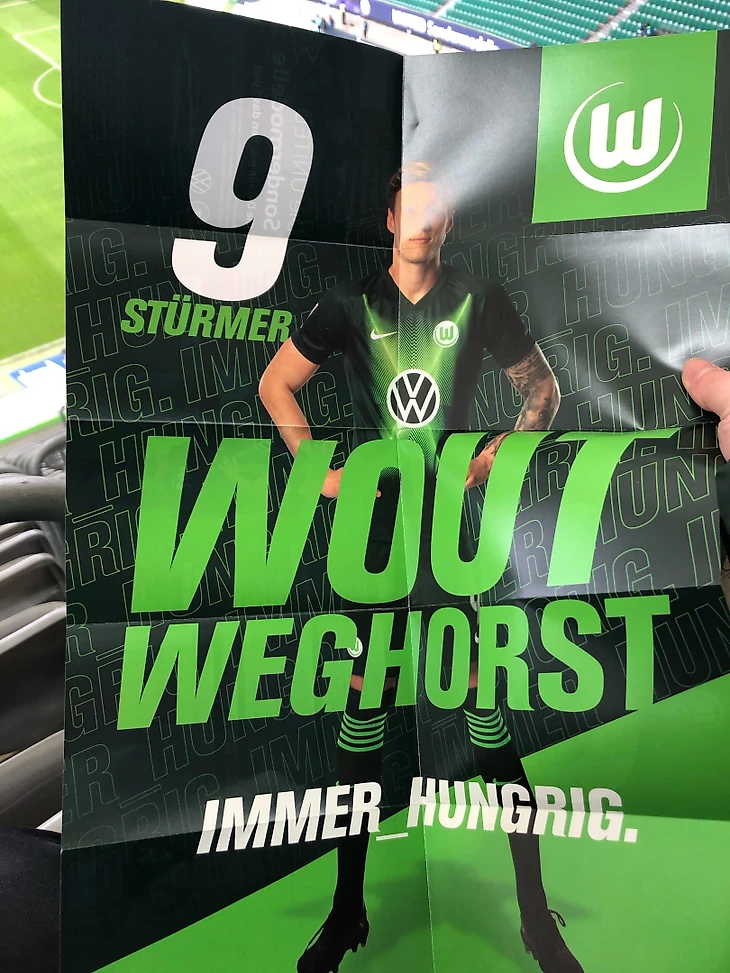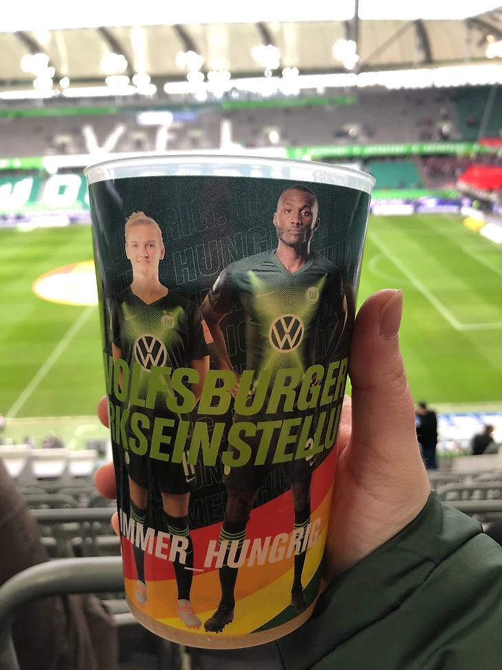 Immer hungrig - всегда голодные. "Волки" и "волчицы" на стаканах, постер с Ваутом Вегхорстом в программке к матчу. Все баннеры на стадионе намекают на происхождение команды и завод. Их девиз "Arbeit, Fussball, Leidenschaft" - работа, футбол и страсть, а их дом - Autostadt, то есть автомобильный город.