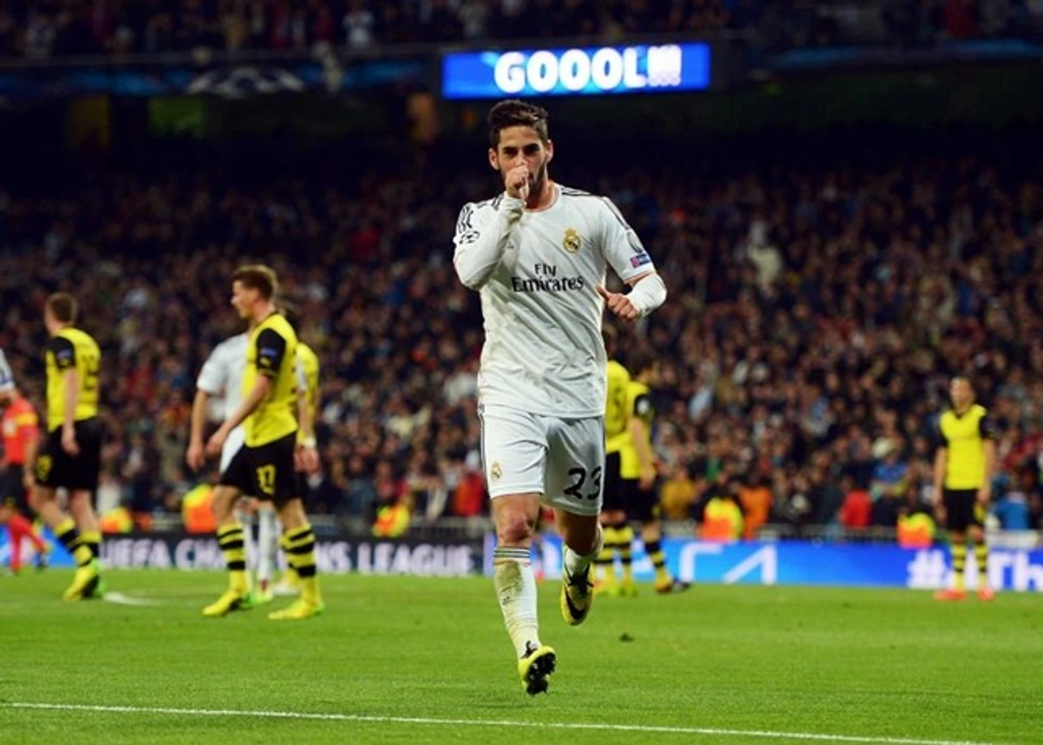 В своем домашнем матче Реал Мадрид камня на камне не оставил от команды Клоппа, разгромив немцев в родных стенах со счетом 3-0. Учитывая, что дортмундцы сезоном ранее катком прошлись по подопечным тогда еще Жозе Моуриньо на Сигнал Идуна Парк, такой счет был настоящей вендеттой. Конечно, Боруссия в сезоне 2013/2014 была уже не та, игра пошла на спад, однако все же немцы были командой, еще год назад игравшей в финале Лиги Чемпионов, что и доказали в ответном матче, изрядно потрепав нервы болельщикам Мадрида. На Сантьяго Бернабеу же коллектив Анчелотти трижды распечатал ворота соперника - голами отметились Бэйл, Иско и Роналду. Особенно, думаю, фанатам запомнился гол испанца, который в окружении нескольких соперников технично и изящно пробил впритирку со штангой.