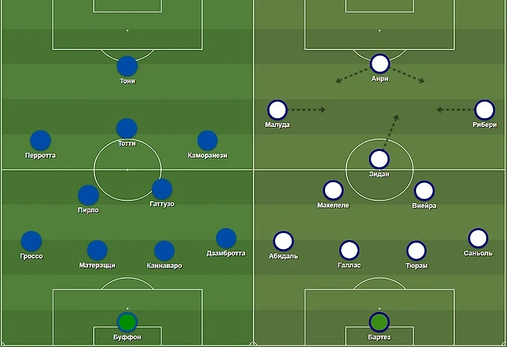 У французов был явный стартовый план — не влезать с итальянцами в вязкую изматывающую игру и взвинтить темп с первых минут. В помощь — молодые и свежие атакующие фланги + движение Анри без мяча и его дриблинг. Быстрый вертикальный стиль французов прослеживался еще по ходу плей-офф, когда Доменек (либо сами игроки) нашел подходящий атакующий вариант — Рибери и Малуда создавали необходимую ширину и обладали достаточными скоростными и техническими скиллами, а Анри гораздо полезнее играл в роли единственного чистого форварда (с оттяжкой в глубину).