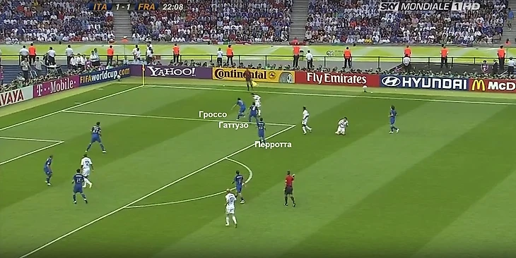 А вот пример оборонительных действий Перротты — в этом эпизоде он оказался даже глубже Пирло (собственно, страховал самого Пирло). Такой стиль игры номинально атакующих хавбеков заметно мешал французам двигаться через фланги. А взлом по центру зависел только от индивидуальных качеств Зидана и Анри.