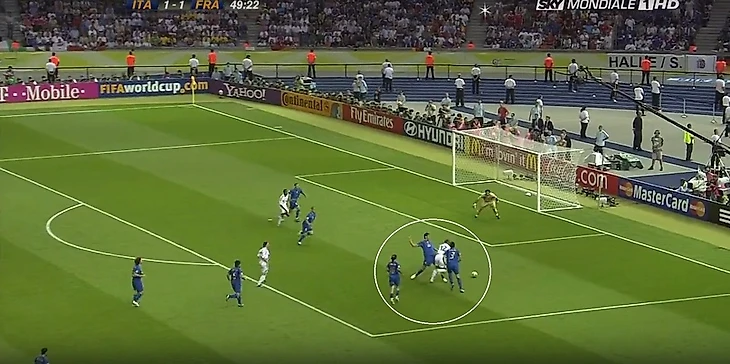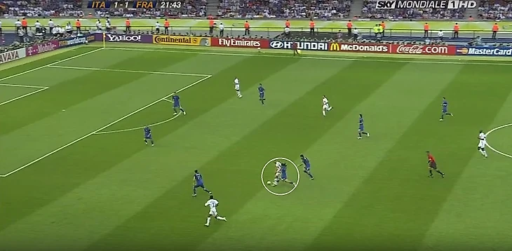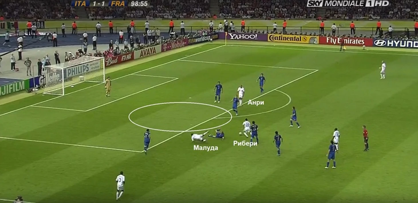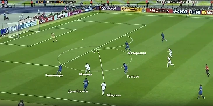 До гола Зидана французы дважды разворачивали такие атаки — сначала Зидан отдал слишком сильную передачу, затем пас Тюрама перехватил Гаттузо. В итоге, результативным получился вынос Бартеза на Абидаля — защитник «Лиона» скинул мяч в свободную зону, куда ускорился Малуда. Того догнал Матерацци, но Элисондо зафиксировал фол.