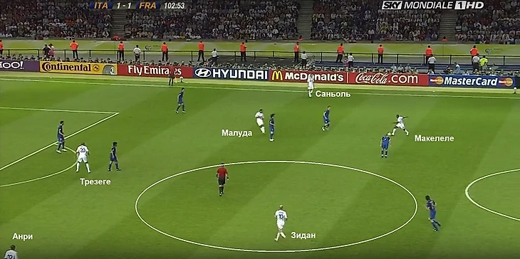 Доменек решился на нетипичную для себя авантюру — выпустить в зону контроля Каннаваро-Матерацци свежего игрока. Им стал Трезеге. Малуда при атаке уходил в правый полуфланг, а остальные игроки растягивали итальянцев до тех пор, пока не возник этот эпизод. Обратите внимание, сколько пространства появилось у Зидана:
