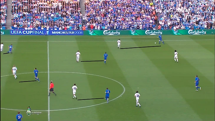 7. «Рейнджерс» располагались в защите низким блоком, подобному 4-4-2. Однако, когда «Зенит приближался к воротам примерно на 30 метров, четвёрка защитников была подобна четвёрке центральных дэфов. Крайний хав или опорник ускоренно опускался и становился фланговым защитником.