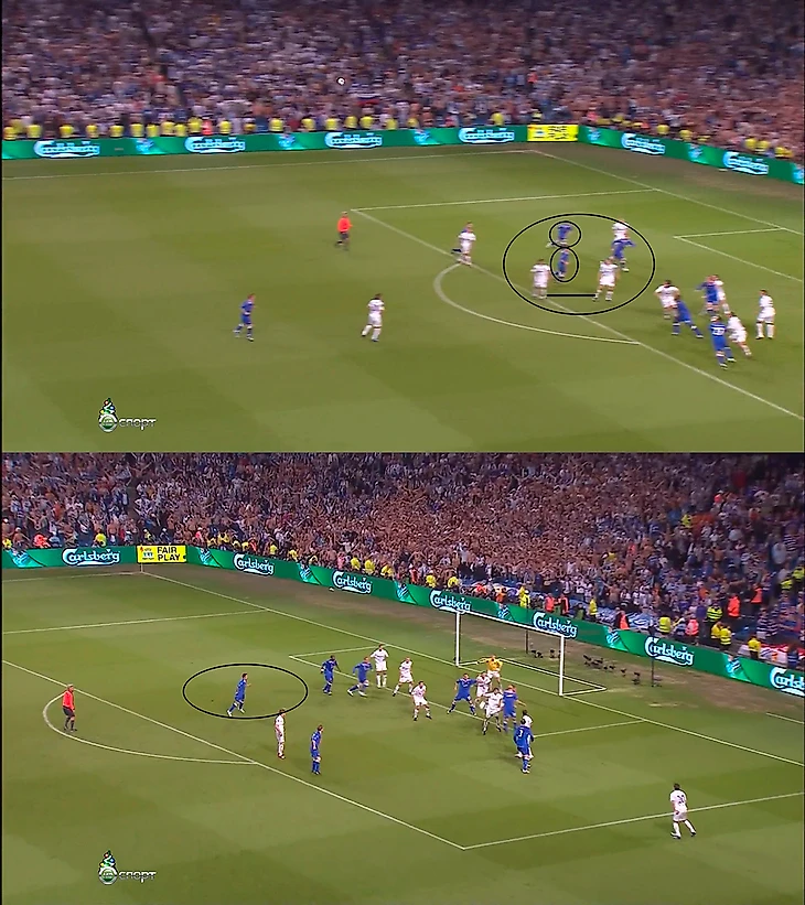 Мы видим, что если в правой части штрафной «Зенит» имеет преимущество и спокойно выигрывает верх, то в левой всё менее строго. Игроки «Глазго» чувствуют там себя достаточно свободно, оттуда и придёт момент Начо после опасно брошенного аута.