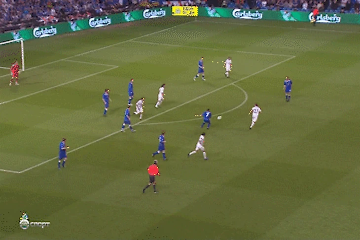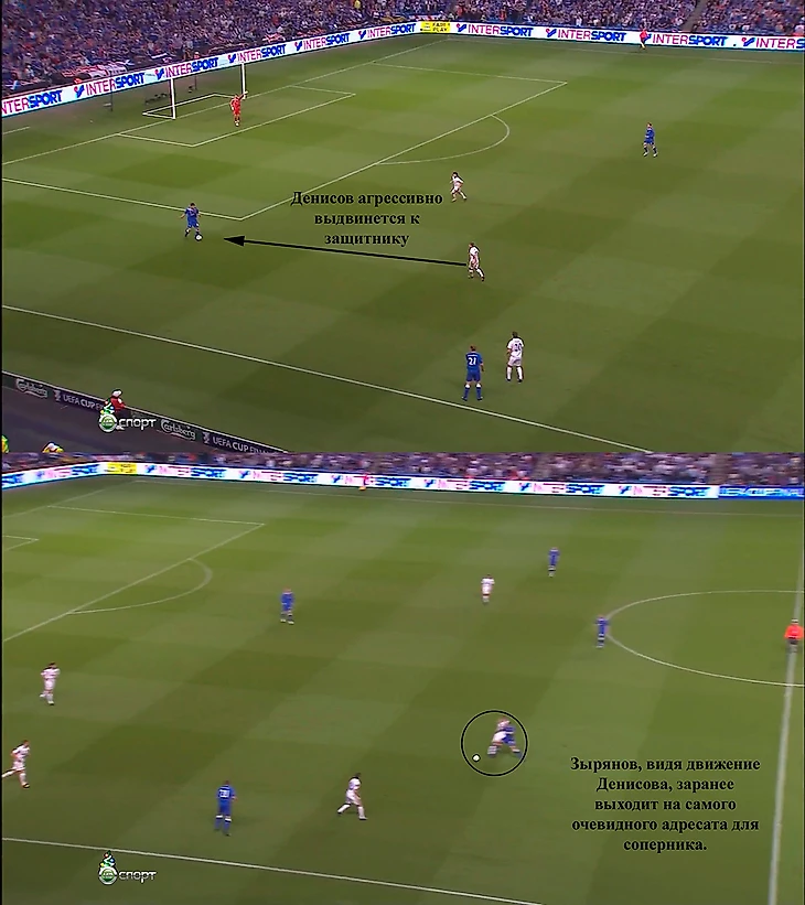 Бродфут не участвовал в эпизоде, закрывая возможное подключение на его фланг. Карлос Куелер выскакивал на Аршавина, тогда как в его сторону устремился Игорь. На гиф-изображении мы видим ошибку 3-го номера: он зачем-то оглянулся в сторону Текке, потеряв на этом долю секунды, которой Денисову хватило, чтобы оторваться.