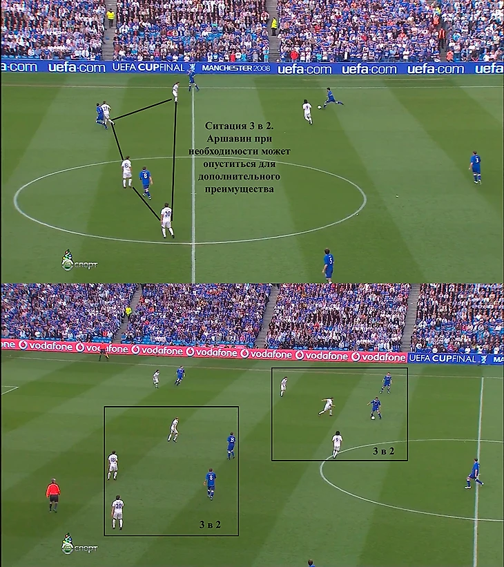 Вырисовывается тактический план по центру поля: Тимощук сдерживает игрока в опорной зоне, Денисов-Зырянов, в зависимости от своего расположения, выдёргиваются в прессинг к центральному кругу. Аршавин-Файзулин могут страховать их на флангах, в таких случаях даже если теряется противостояние 3/4 – 2/3, то оно будет равным и без преимущества британцев в наших зонах.