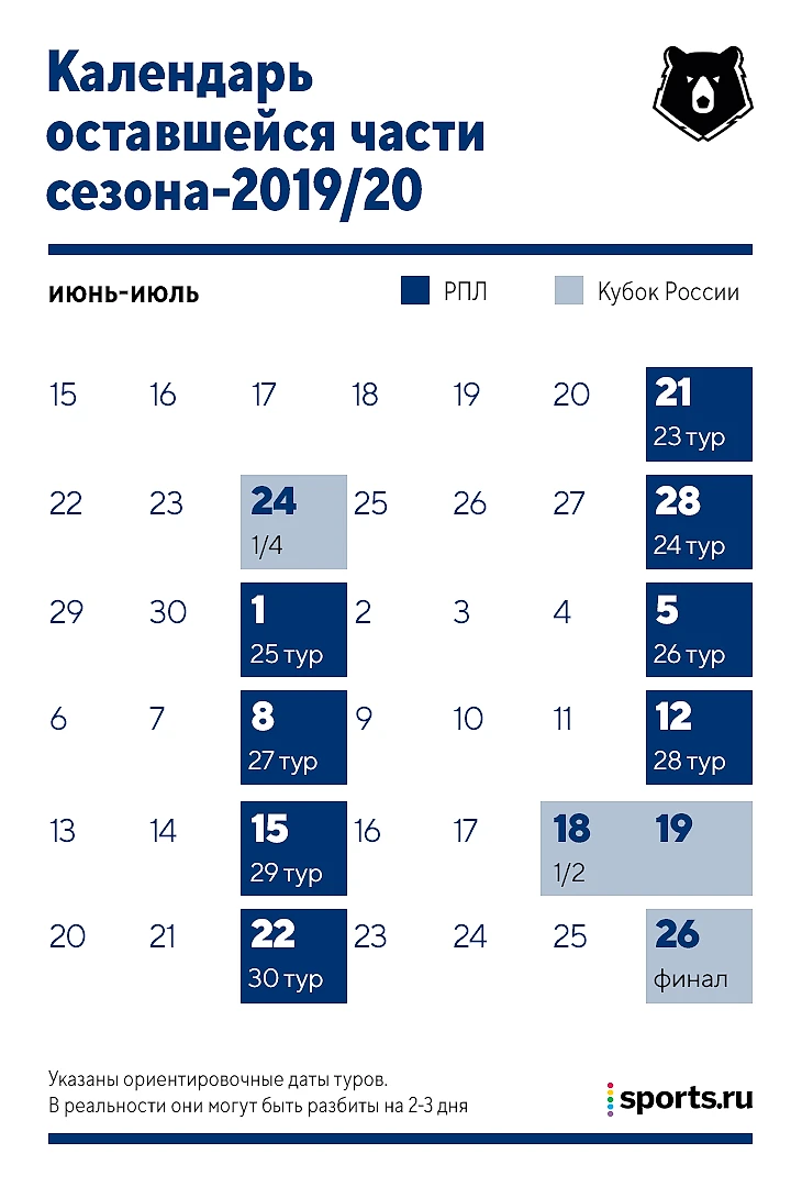 Так как решено доиграть Кубок России, РПЛ финиширует туром посреди недели – 22 июля в среду. А в субботу на последней неделе сезона проведут финал Кубка России. Суперкубок перенесли на декабрь.