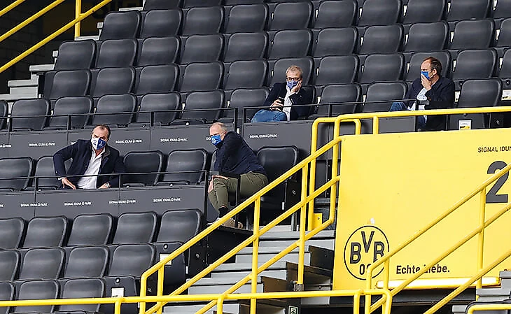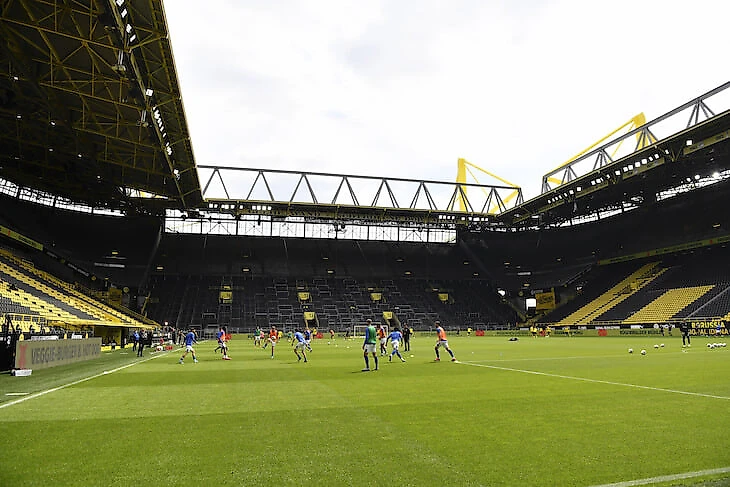 Социальная дистанция для запасных. Немецкие стадионы специально перестроили с учетом новых требований. На трибунах не случайные люди, а персонал клубов.