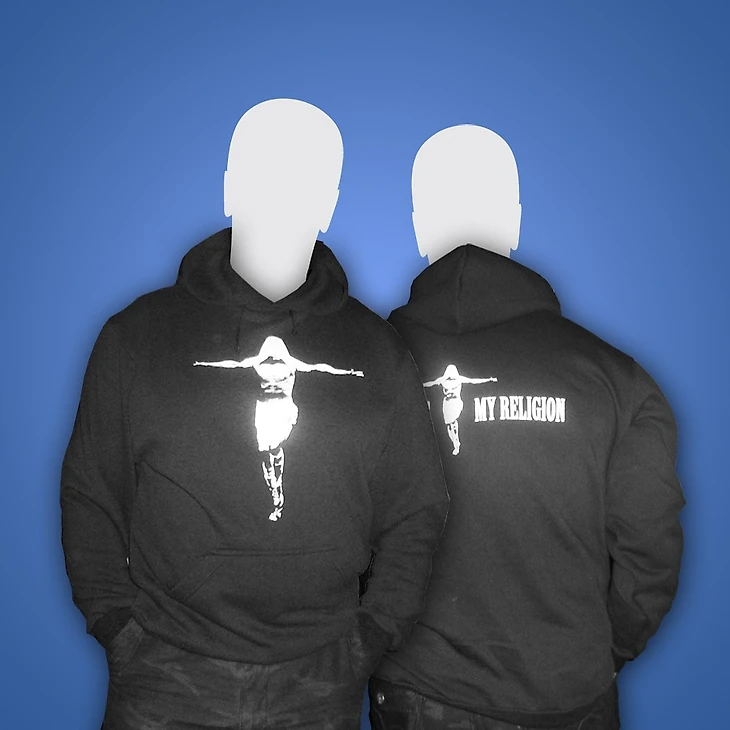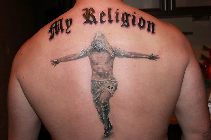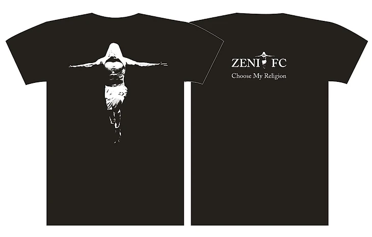 А потом случилось чудо — был «увиден» образ, отсылающий к кресту и распятию, вспомнилась футболка Арсенала, которую чуть не купил на выезде в Англию ещё в 2005-м со слоганом Football Is My Religion, Highbury Is My Church, ещё немного метаний под лозунгом «лучшее враг хорошего» и, в конце концов, вариант окончательнейший. Ничего лишнего.