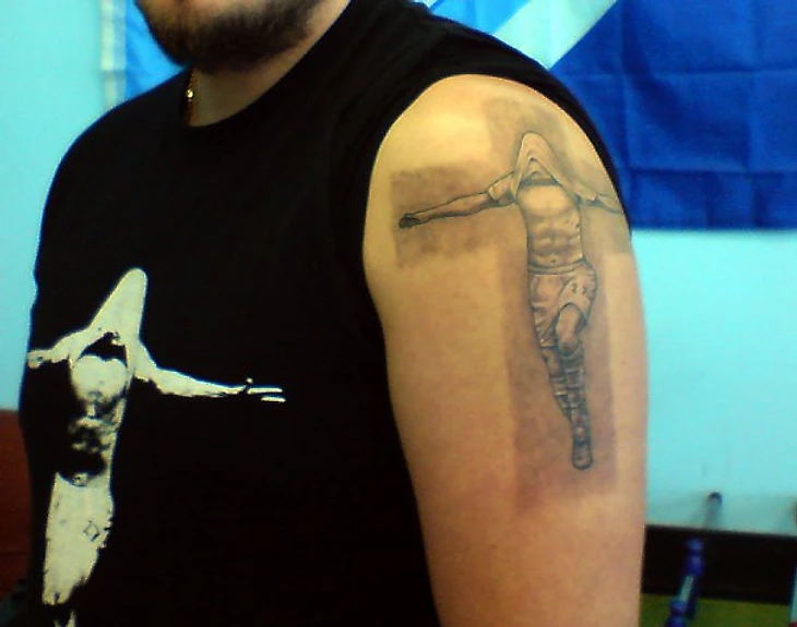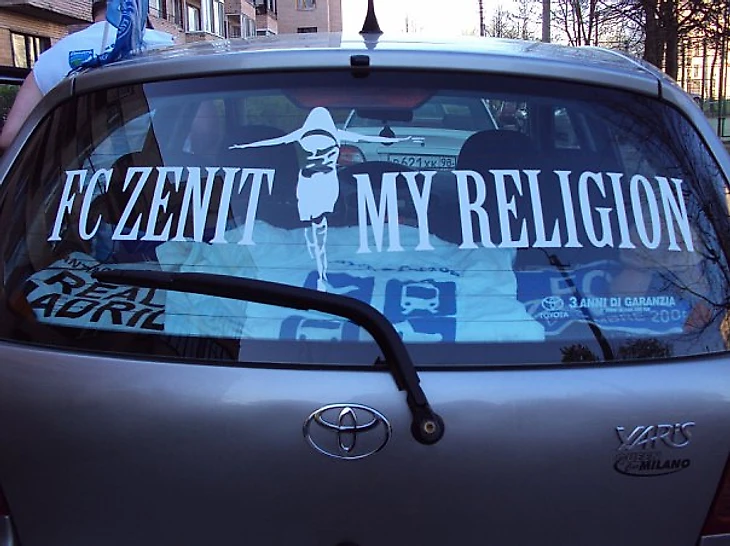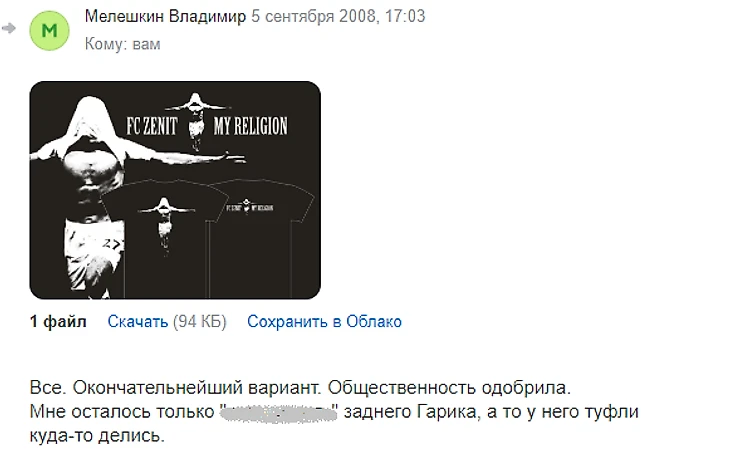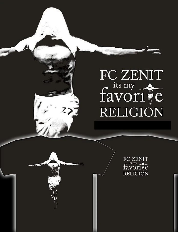 Вспомнилось, как осенью 2009 или весной 2010, когда футболки и худи с изображением, напоминающим распятие, были настолько распространены, что массовые скопления зенитовских болельщиков по отзывам очевидцев напоминало «то ли шествие крестоносцев, то ли мушкетёров», коммерческий отдел клуба обратился к нам, создателям этого принта, с предложением о продаже прав на его производство и продажу. Мы согласились и предложили обсудить довольно скромную сумму (в 20 раз меньшую, чем заплатил «Зенит» какому-то креативному агентству за абсолютно провальный концепт "Команда супергероев»). Предложение было названо почему-то «крамольным». Нам было объяснено, что права на изображение игрока и название команды принадлежит клубу и мы продаём свои футболки незаконно. На том история с приобретением прав и закончилась.