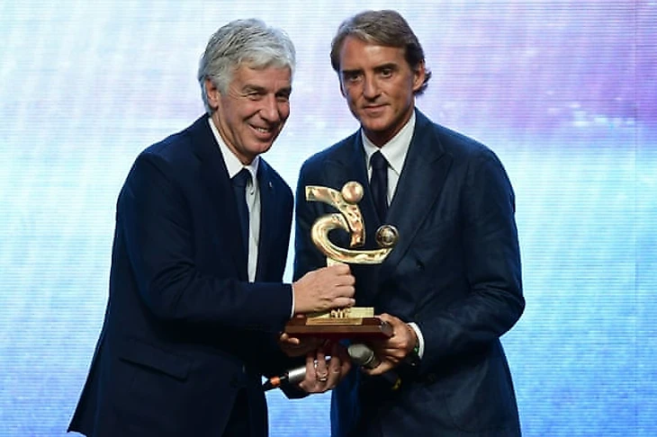 Манчини вручает Гасперини награду "тренер года 2019". Фото: Miguel Medina / AFP / Getty Images