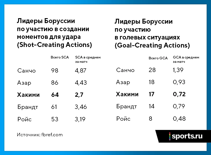 Большинство голов «Боруссия» забивает после передач в ходе комбинаций. Помимо всего, Хакими полезен тем, что заставляет соперника часто на себе фолить и команда зарабатывает право на удар.