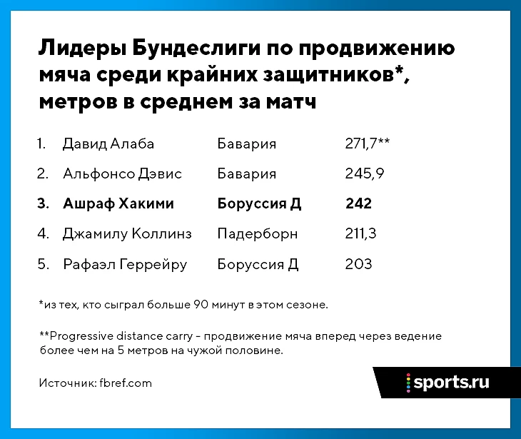 Ашраф лучший в «Дортмунде» по продвижению атаки через пас (progressive passes). Но мяч можно двигать вперед не только пасом, но и обводя соперника на скорости. Среди крайних защитников Бундеслиги Хакими – один из лучших в этом компоненте.