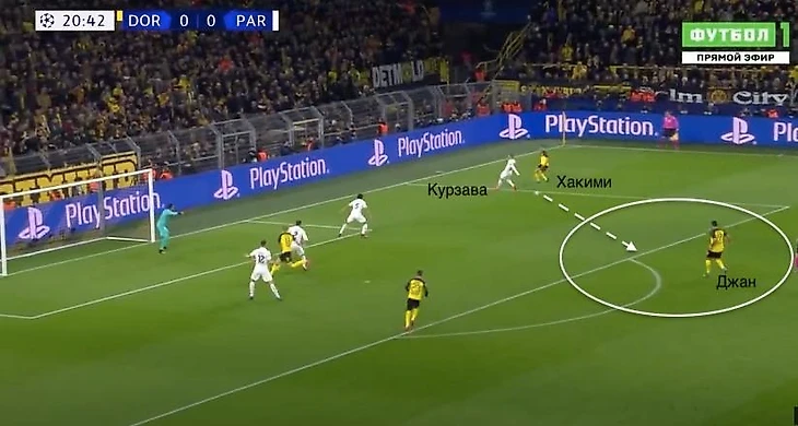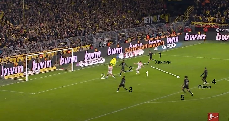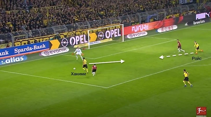 Особенно эффективно этот маневр смотрится, когда «Боруссия» делает вид, что садится в оборону и отходит к воротам. В этот момент Хакими выдвигается чуть вперед, предугадывая адресат паса у соперника, перехватывает мяч и уходит в отрыв.