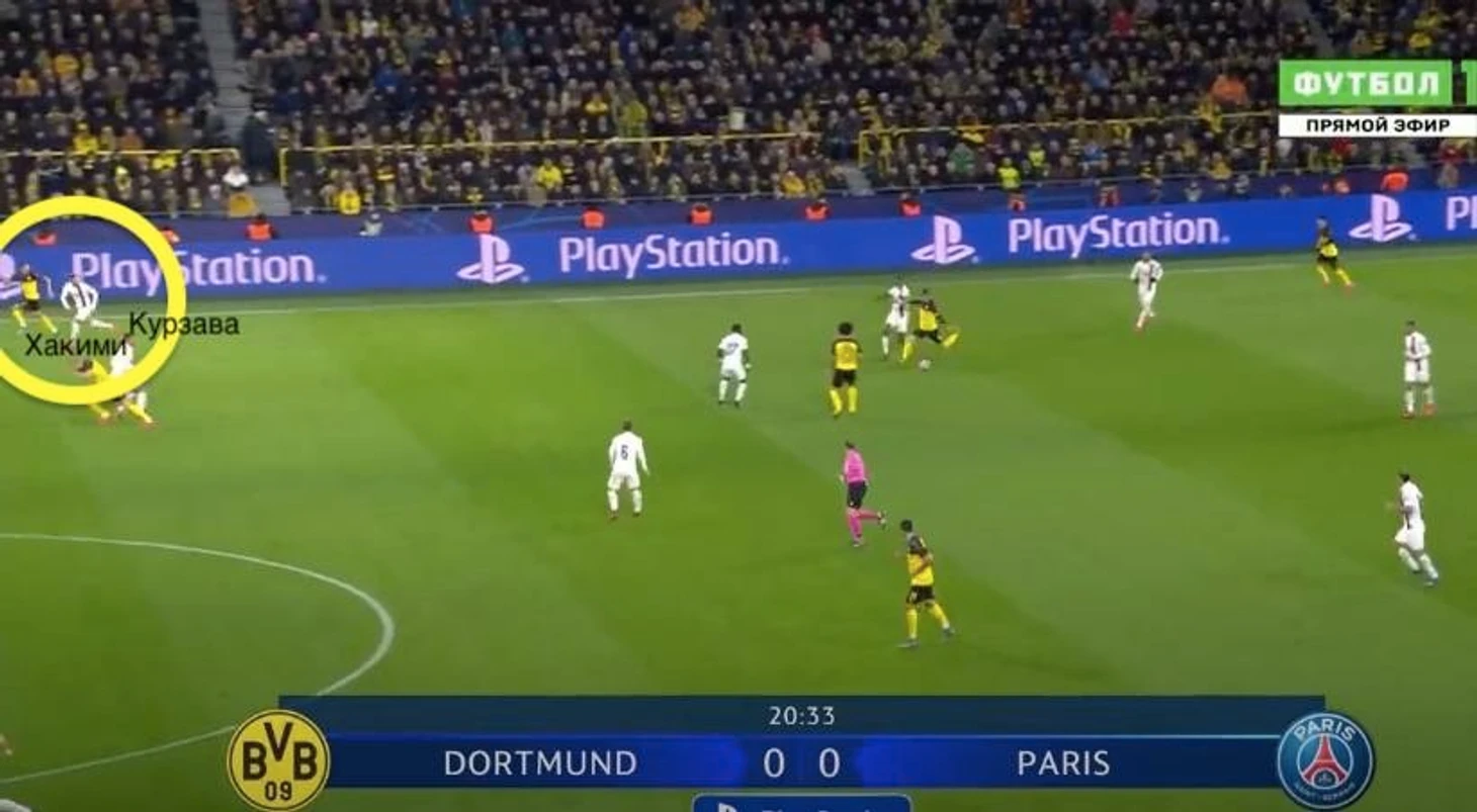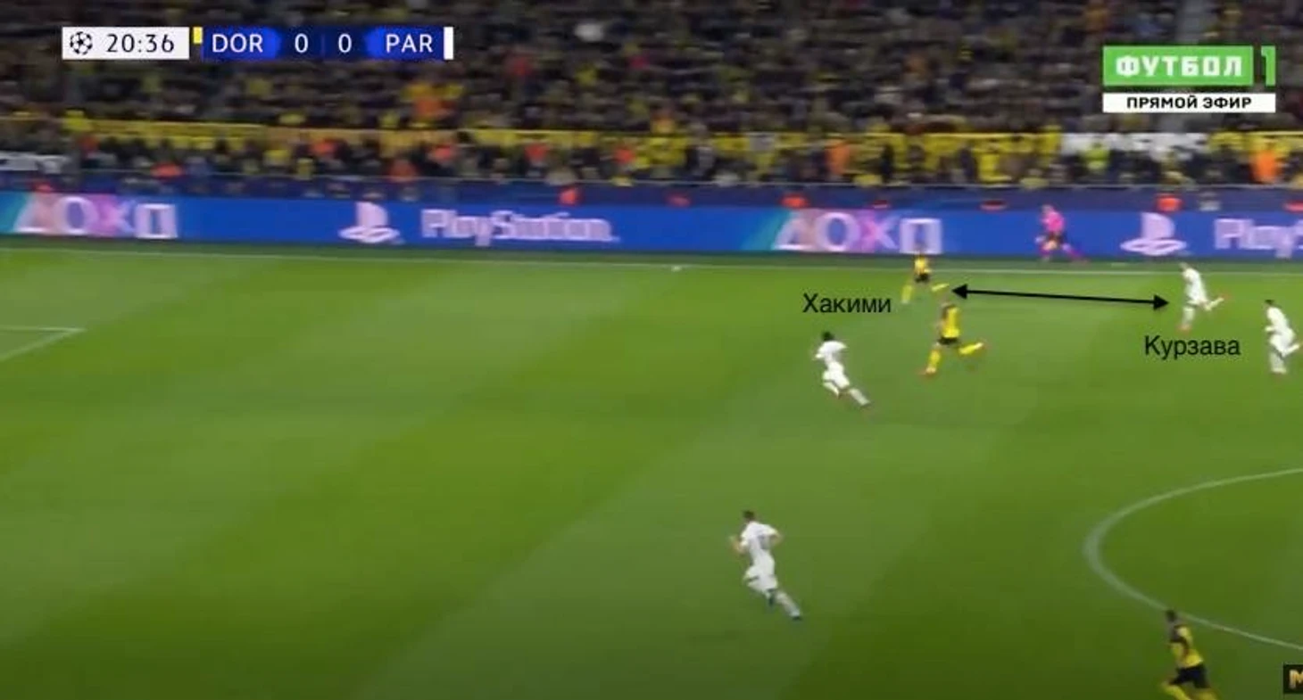 Домашняя игра против «ПСЖ» в феврале этого года. Левый защитник «Парижа» Курзава оставил за собой много пространства и не успел за Хакими, которого отправили в прорыв.