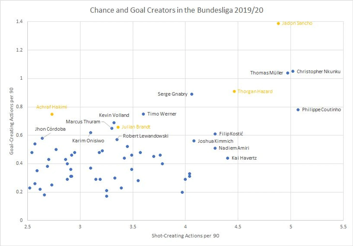 Мы видим, что самый полезный атакующий игрок Бундеслиги – Джейдон Санчо, но Хакими тоже держится в топе (помним про то, что он номинальный защитник).