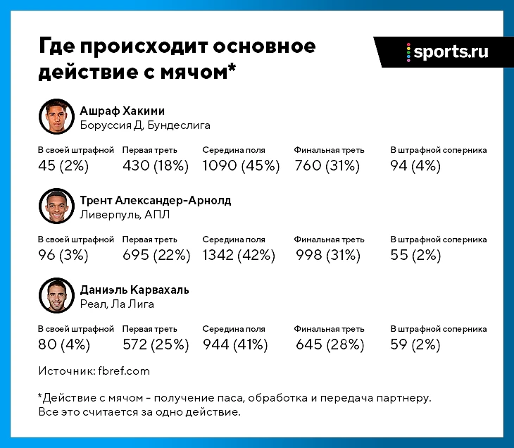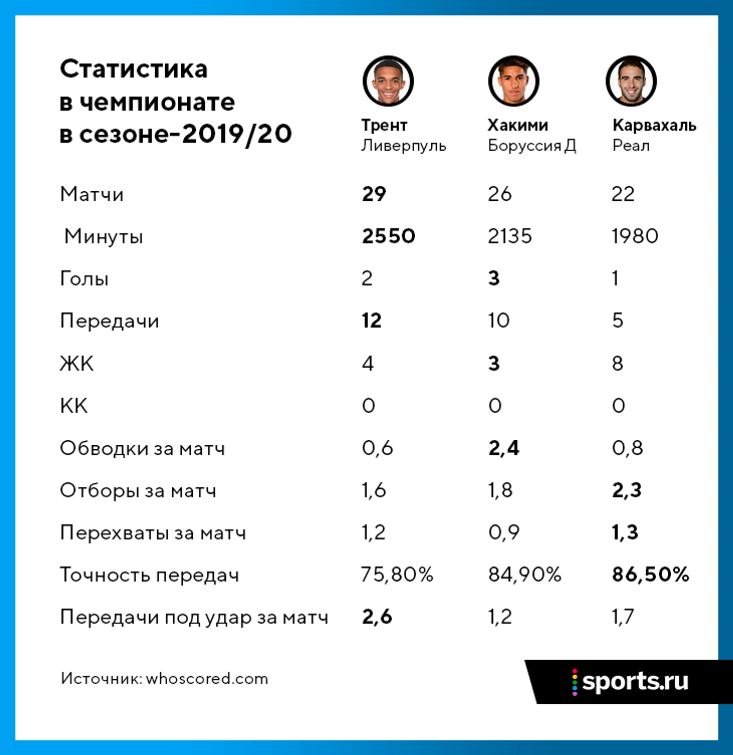 Сравним Хакими с двумя признанными звездами, играющими на его позиции. Трент здесь – потому что лучший правый защитник мира прямо сейчас. Карвахаль – потому что в перспективе конкурент Хакими за место в основе «Реала».