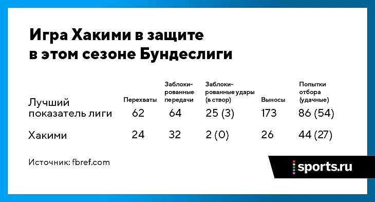 На второй год 21-летний Хакими превратился в системообразующего игрока «Дортмунда» (единственный в клубе, кто сыграл во всех матчах в текущем сезоне). С переходом команды на систему 3-4-3 молодой марокканец еще больше участвует в атаке, что отразилось на его результативности.