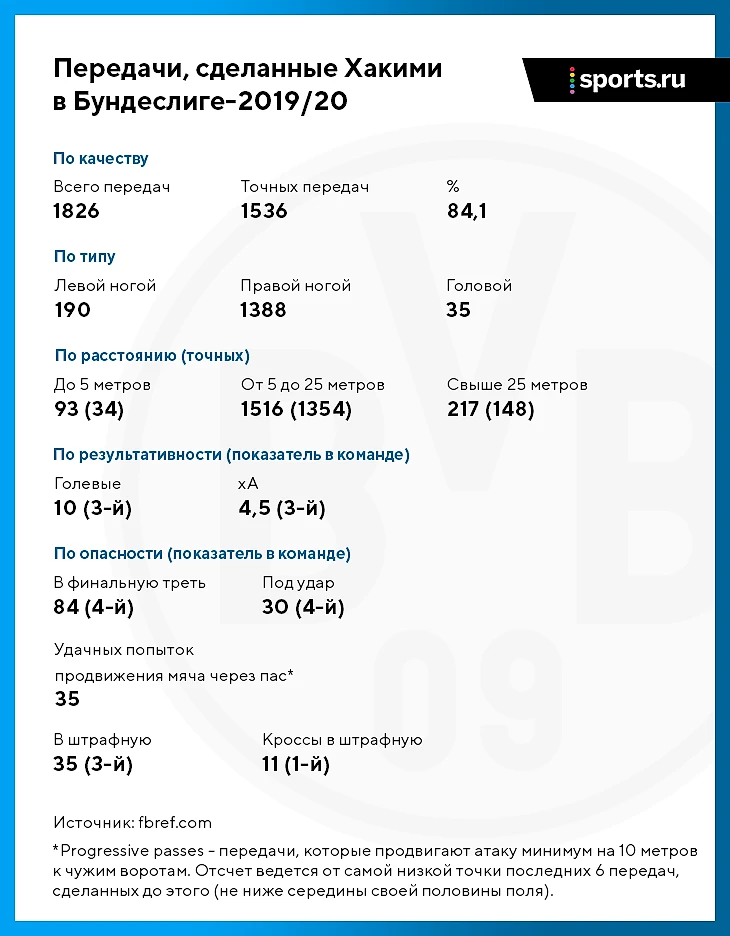 Хакими сделал больше всех точных передач среди дортмундцев в этом сезоне и на него чаще всего пасуют партнеры, что говорит о его важности в построении игры. Давайте разбираться в типе и качестве этих передач.