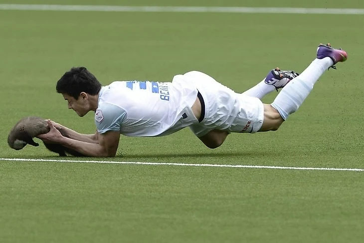 Далее футболист «Цюриха» Лорис Бенито совершил отчаянный прыжок вперед «рыбкой» для того, чтобы поймать непрошенного гостя.