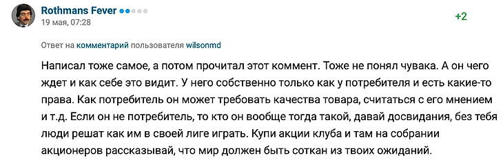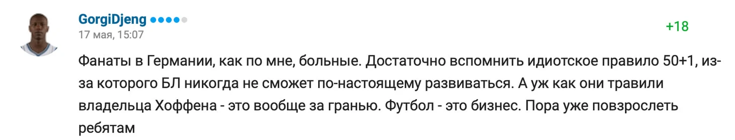 Да, многие описанные в тексте вещи действительно имеют место быть, но релевантны они только для небольших клубов, к коим и можно отнести Унион. В случае с большими клубами, ярчайшим примером которого является Бавария, все совсем иначе. Ну т.е. ок, члены РБЛ ничего не решают, все там решают за них где-то в Австрии. Но вот у меня уже приличное количество лет есть тоже самое пассивно членство, но в Баварии, как и у автора в Унионе. И я вообще ничего не решаю. Да, проводятся ежегодные собрания членов клуба, на которые я, как человек обладающий заветной карточкой, тоже могу придти. Но выглядят они как простая отчетность. Вот тут мы заработали столько денег, а вот у нас прибавилось столько членов, а вот сколько у нас новых фан-клубов зарегистрировано. И вот такие мы классные и спасибо что остаетесь с нами. Как-то так. Но никаких вопросов на обсуждения не выносится. Но даже если бы и выносились, то на Ауди Дом, где проводятся эти собрания, вмешает в себя тысячи три. 1% от общего числа членов. Так что голосовалка была бы так себе. Значит ли это, что Бавария так же ужасна как РБЛ? Да нет. Вполне традиционная даже по мнению немцев. Но болельщики тут мало что решают. Даже за простую вещь вроде цветов формы война идет уже не одно десятилетие. И все это при том, что немцы даже основанный 1904 году Байер приравнивают к ужасным пластикам типа РБЛ и Хоффе. Просто вот не повезло им основаться на базе концерна. Так что не все, что делают и думают немецкие ультрас обязательно логично и правильно, как принято считать в рунете.