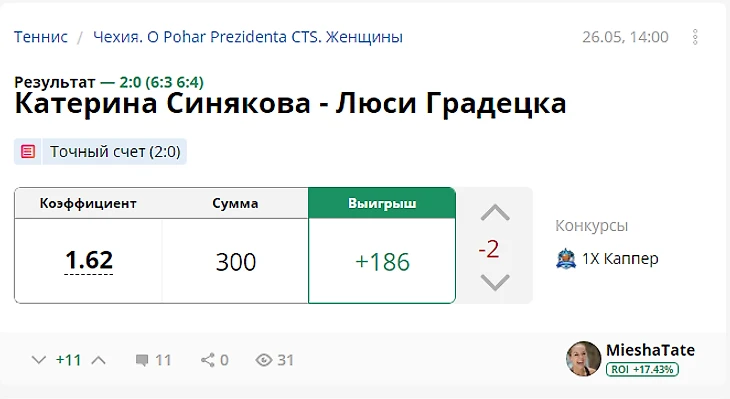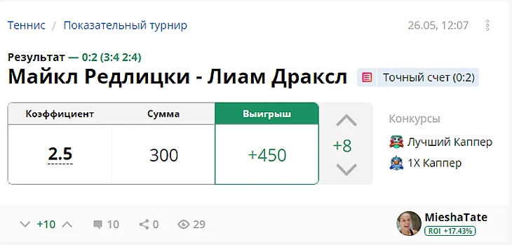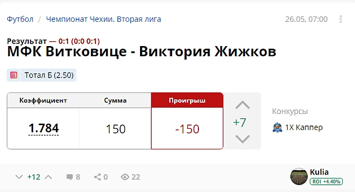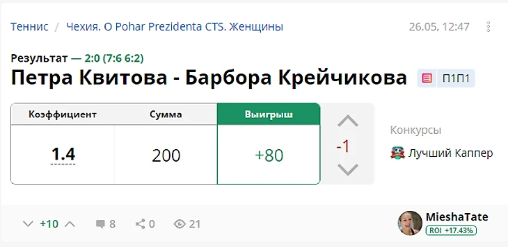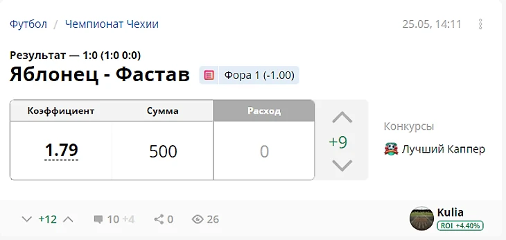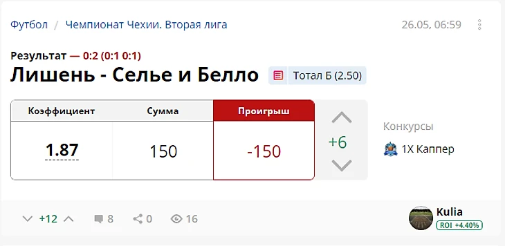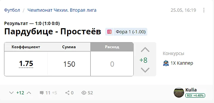 Результат с учетом ставок капперов: +737 рублей (ROI 36.85)