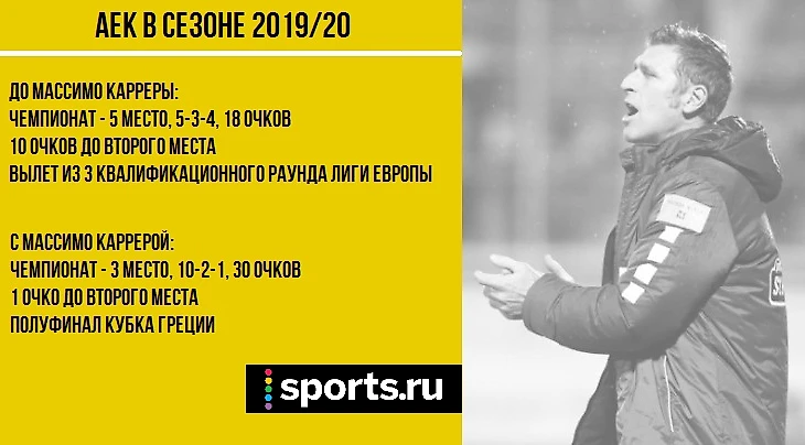 Это сейчас можно говорить о том, что у Массимо получается едва ли не все. Однако мне такая история до матча с ПАОКом казалась несколько случайной. Итальянец тогда вполне неплохо вкатился в Грецию, набрав 10 из 12 очков. И как раз игра в Салониках должна была всерьез показать какие-то перспективы, ведь это команда, идущая выше в таблице. Что произошло в итоге? АЕК, решив изменить тактику, проиграл, приехав скорее отобороняться и уехать с нулевой ничьей. А главная проблема вылилась после пропущенного гола – старый ход Массимо с проблемой замен во втором тайме. АЕК не смог перестроиться с душного контратакующего футбола на что-то более увлекательное. Потому что Каррера и минимализм – это на поверхности синонимы. В общем, все написано в моем обзоре здесь.