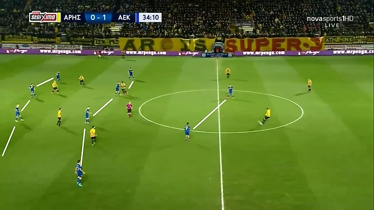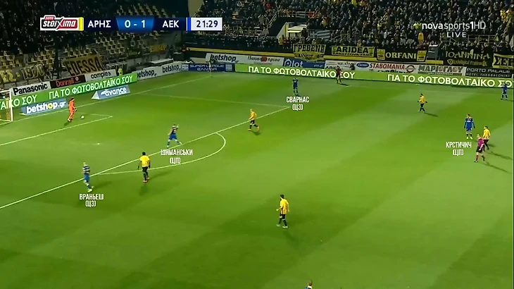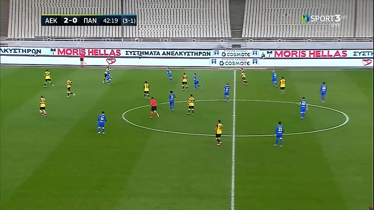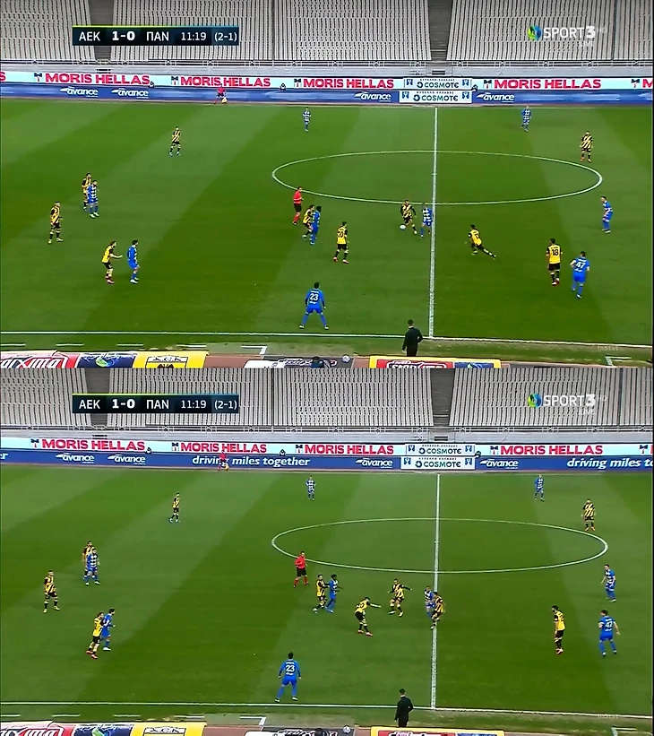 Матч с ПАОКом был первым, где Массимо попробовал схему с двумя центральными защитниками. До этого АЕК выходил с тройкой центрдефов, при этом их состав сильно ротировался – всего Каррера в этой зоне за первые четыре игры попробовал аж шестерых (!) игроков. Стоит сказать, что у афинян тут по меркам местного чемпионата игроки качественные – Чигринский, Враньеш, Иконому, Сварнас, зимой пришел еще юный словенец Лаци, и это только профильные по позиции игроки. По матчу с ПАОКом все тоже было в порядке – нельзя сказать, что первые двое, игравшие тогда в основе, проигрывали верх или не успевали за соперниками.