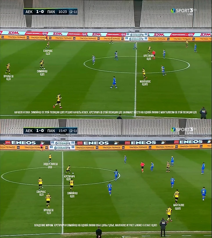 А к тому, что в случае оттяжки центрфорварда или вингеров на другую позицию, капитан занимает это место в атаке. Это все красиво подчеркивается той самой карреровской игрой впереди в линию, когда действовать поуже для резкого открытия фланговых защитников – это один из стилей итальянца. Так было и в «Спартаке», когда Промес и Самедов смещались ближе к Зе Луишу, создавая свободу для Комбарова с Ещенко. Ну а уж Бакакис здесь таким только наслаждается. И если вингер/инсайд отходит за мячом назад, то его место занимает капитан Манталос. Такие вот хитрецы в штабе Карреры работают.