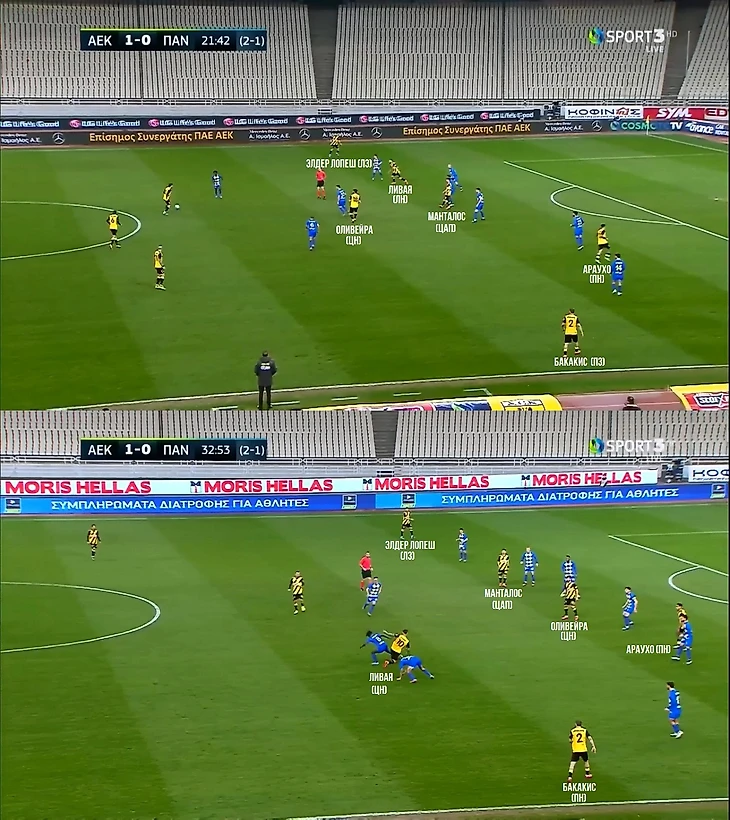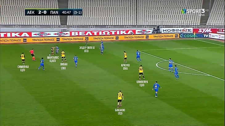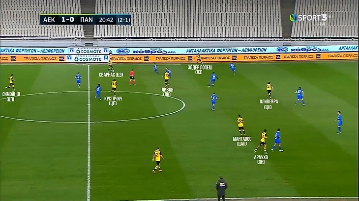 Очень полезно в АЕКе действуют вингеры. Можно сказать, это и не вингеры вовсе. В атаке, например, это инсайды. Во-первых, они оттягиваются назад при защите – девять игроков на своей половине поля никто не забывал. Во-вторых, они активно предлагают себя для мяча при позиционной атаке, особенно старается Ливая. Делают они это для того, чтобы вольготней себя чувствовали крайние защитники, которые играют высоко, а ведь за ним как за очень опасным игроком всегда приставлен соперник. Они также перенасыщают зону, где находится мяч, уменьшая шансы его потери. В-третьих, они не всегда играют вингеров. Массимо тасует футболистов как игральные карты, поэтому тогда, когда выходит тройка чистых нападающих (как это было с «Панетоликосом»), то они играют все вместе в штрафной, если мячом владеет кто-то другой из команды. Получается адская смесь из трех лучших нападающих (а каждый еще имеет и прекрасную статистику – на момент карантина у Ливаи 10+9, у Оливейры 11+7), готовая расстрелять ворота здесь и сейчас.