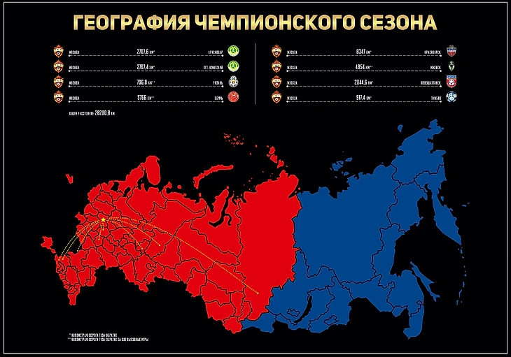 На 14-15 страницах «География чемпионского сезона» – опять же, красиво: карта страны с указанием километража выездов. Полезная штука для «золотников» и тех, кто бьет выезда. На секундочку, общее расстояние выездов – 28 200 км.