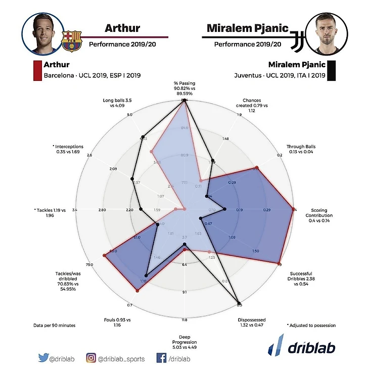 Тем не менее, многим болельщикам такая сделка кажется не выгодной (причем как фанам «Барсы», так и «Юве»). Статистический портал Driblab опубликовал сравнительный график игровых показателей Пьянича и Артура.