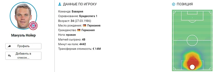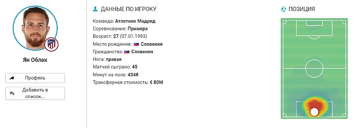 По тепловой карте мы можем видеть, что Облак редко покидает пределы штрафной площади.