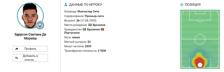 По тепловой карте мы видим, что Эдерсон играет достаточно высоко от линии ворот.