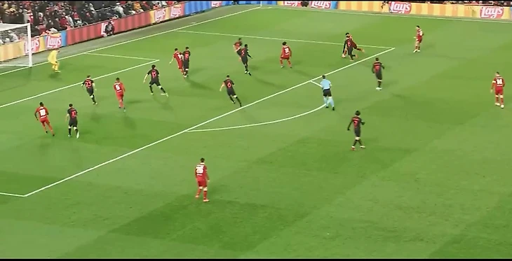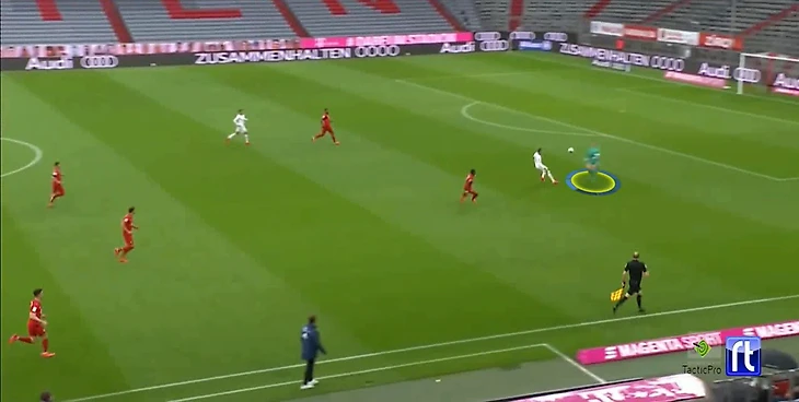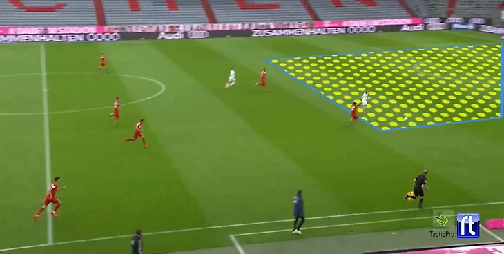 Видим какое большое пространство за спиной линии обороны, которое с успехом может использовать атакующая группа игроков команды соперника. Но через мгновение М. Нойер компенсирует это пространство и подбирает мяч.
