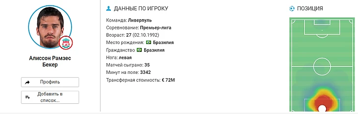 По показателям тепловой карты мы можем понять, что Алиссон, как говорится, не привязан к линии ворот, а играет смело за штрафной площадью.