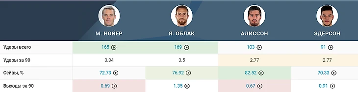 Мы видим, что число нанесенных ударов за матч и за сезон больше у Облака и процент отраженных ударов выше только у Алиссона. На выходах он играет чаще остальных.