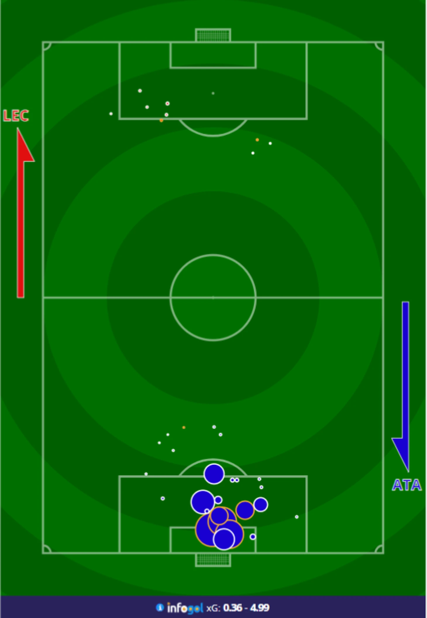 Вот пример xg-карты матча Аталанты против Лечче. Чем больше круг, тем выше вероятность гола с этого удара. По карте мы без просмотра можем понять, как сильно одна команда доминировала над другой по качеству голевых моментов.