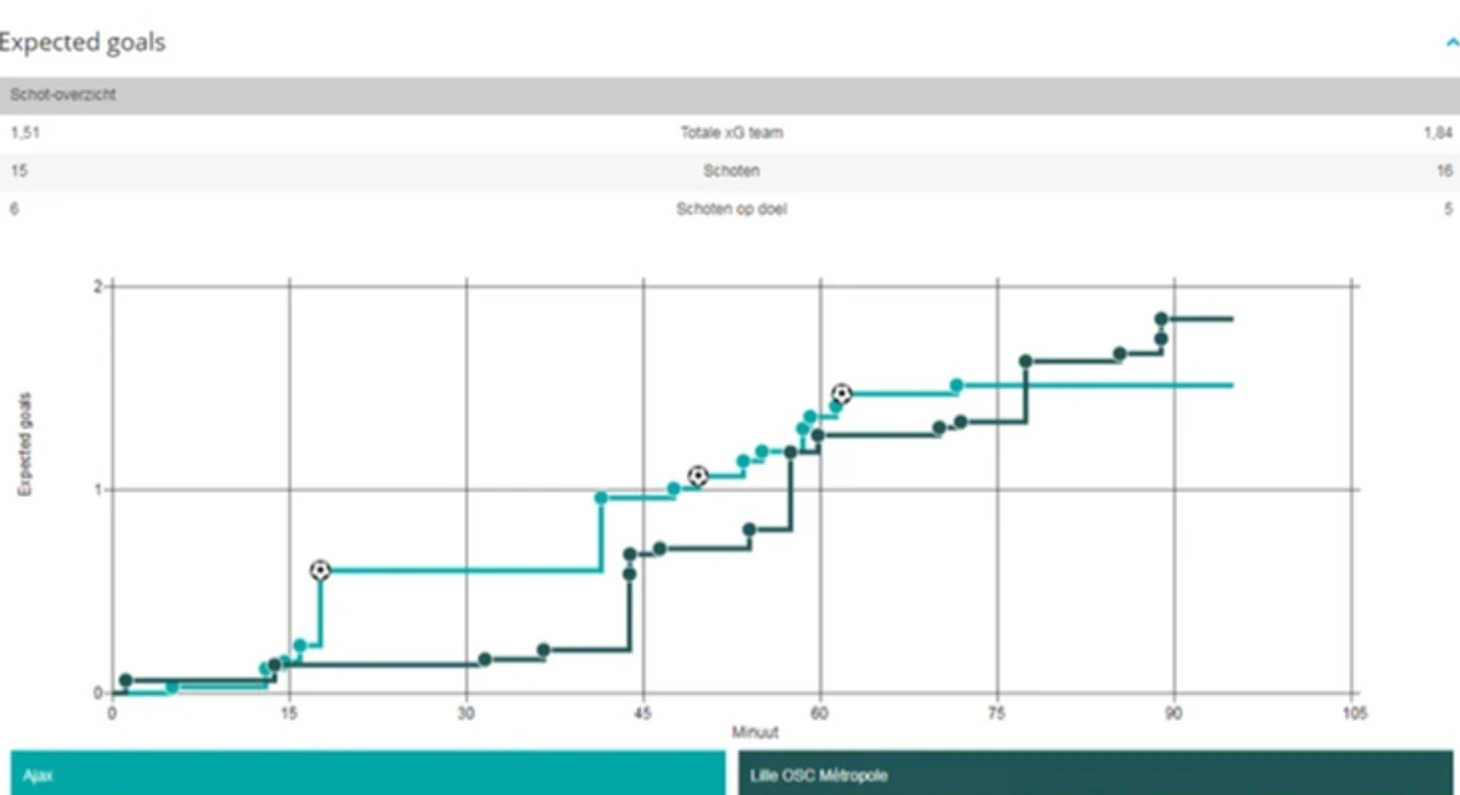 Графики xG-Plot показывают динамику изменения xG на протяжении матча. Если вам кажется, что ваша команда отыграла вторую половину значительно лучше соперника, просто взгляните на xG-Plot. Вполне возможно, что вы обманываетесь. Или же футболисты просто не смогли конвертировать свое преимущество в опасные моменты. xG-Plot поможет разобраться в этом вопросе. На примере можно увидеть график матча Аякс-Лилль, который проходил на старте группового этапа лиги чемпионов, где Аякс по счёту уверенно разобрался с соперником 3-0, но как мы видим по графику, Лилль почти ни в чём не уступил сопернику, лишь иногда отдавая инициативу и позволял себе проигрывать некоторые 5минутки.