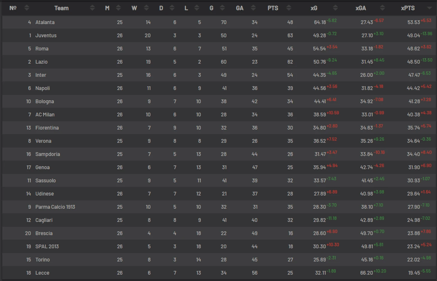А если подсчитать таким образом не только один матч, а весь чемпионат, то мы получим таблицу, основанную не на реальных очках, а на ожидаемых (xPoints). То есть на очках, которые команда заслуживала получить исходя из остроты моментов, созданных в каждом матче. Тут мы уже можем увидеть, что Аталанта была бы на первом месте в чемпионате, если бы реализация голевых моментов у них была на среднем уровне, а не ниже среднего. Очень хорошо в этой таблице видно, какие клубы на длинной дистанции перебирают или не добирают очки.